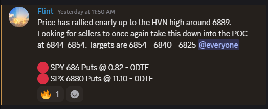 Turning to the cash session, we initially observed a selling phase that reached the lower end of the High Volume Node (HVN) established at the beginning of the week, preceding a subsequent sharp bounce. My thesis was to maintain bearish below the 6908 Value Area High (VAH). Later in the day, this level was breached, resulting in a sharp rally of +21 handles. During the middle of the day, two short signals were triggered. Both came from the 6889 level, which was the upper end of the HVN. On the initial trade, contracts saw a swift 100% rally on both SPY and SPX within a 10 minutes. See the alert below: