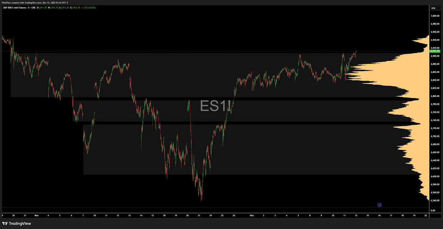 As the price has returned to all-time highs (ATH), we have zero volume to define targets, as trading has yet to occur at higher prices. Consequently, I will utilize round numbers for setting potential targets. Thus, 6950 and 7000 will be the main targets as we move into the end of the week. In the event of a potential sell below the 6908 VAH, we can then reference the clear support and resistance levels established by the profile over the last two weeks.