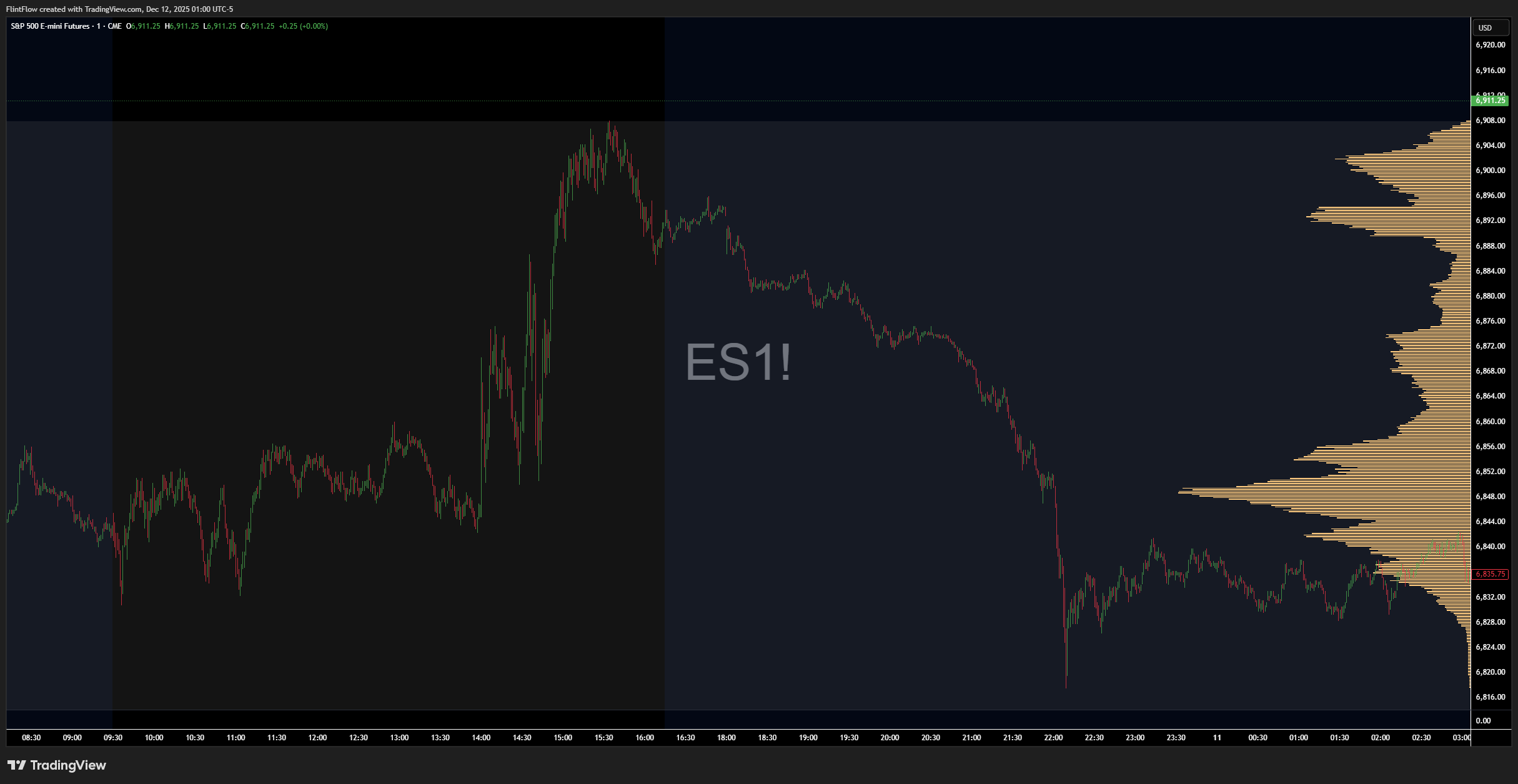 Yesterday’s levels clearly demonstrate the power of Volume Profile in identifying market positioning. After the market close, we discussed how the Value Area High (VAH) and Value Area Low (VAL) function as critical thresholds where market control shifts between buyers and sellers. For the past two weeks, all downward movements have been met with buying near the VAL. Furthermore, the selling observed at Wednesday’s close originated precisely at the 6908 VAH, not a single tick above it. The expected sell-off materialized, pushing the price nearly all the way down to the 6797 VAL. This resulted in a decline of almost 100 handles from the high. We will now review the posted levels and compare them to the chart.