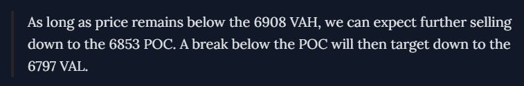 Upon a sell back below the 6908 VAH, I expect a strong sell back down to the POC at 6856.
