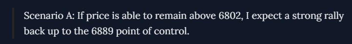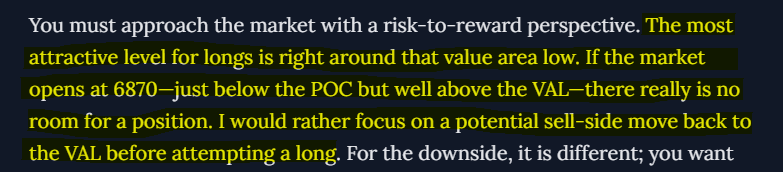I hope you all had a great session, as our levels once again performed at the highest level. We went into the week expecting a major pivot at the 6802 value area low. This, in fact, marked the low before a sharp move right back up to the 6889 target. From there, we saw balance; since this is where the majority of volume has traded, it is a magnetic level where price moved up and down but ultimately balanced out.